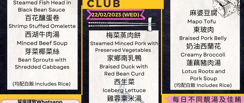 21/02/2023 (星期二Tue) 豉汁魚雲 Steamed Fish Head in Black Bean Sauce 百花釀蛋卷Shrimp Stuffed Omelette 西湖牛肉湯Minced Beef Soup 芽菜椰菜絲Bean Sprouts with Shredded Cabbages 22/02/2023(星期三Wed) 梅菜蒸肉餅 Steamed Minced Pork with Preserved Vegetables 家鄉南乳鴨Braised Duck with Red Bean Curd 西生菜Iceberg Lettuce 雞蓉粟米湯Chicken & Corn Soup 23/02/2023 (星期四Thu) 麻婆豆腐Mapo Tofu 東玻肉Braised Pork Belly 奶油西蘭花Creamy Broccoli 蓮藕豬肉湯Lotus Roots and Pork Soup