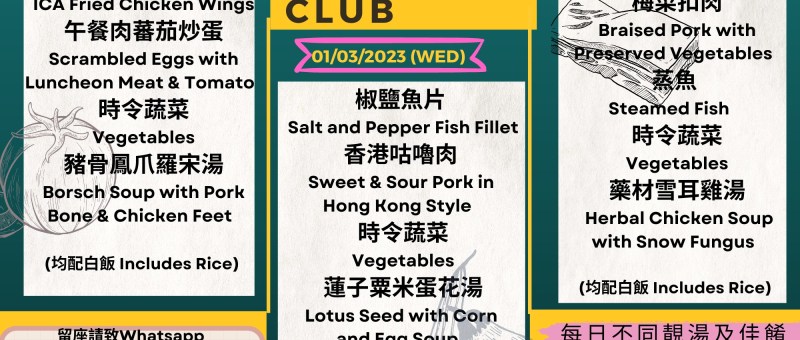 28/02/2023 (星期二Tue) ICA 酥炸雞翼ICA Fried Chicken Wings 午餐肉蕃茄炒蛋Scrambled Eggs with Luncheon Meat & Tomato 時令蔬菜Vegetables 豬骨鳳爪羅宋湯Borsch Soup with Pork Bone & Chicken Feet 01/03/2023(星期三Wed) 椒鹽魚片 Salt and Pepper Fish Fillet 香港咕嚕肉 Sweet & Sour Pork in Hong Kong Style 時令蔬菜Vegetables 蓮子粟米蛋花湯Lotus Seed with Corn and Egg Soup 02/03/2023 (星期四Thu) 梅菜扣肉Braised Pork with Preserved Vegetables 蒸魚…