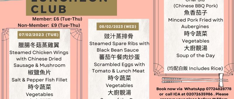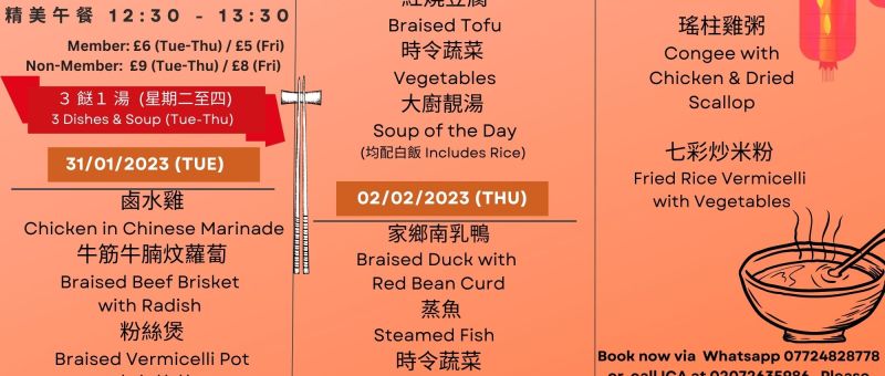 31/01/2023 (Tue) Chicken in Chinese Marinade Braised Beef Brisket with Radish Braised Vermicelli Pot Vegetables Soup of the Day 01/02/2023(Wed) Sweet & Sour Chicken Braised Tofu Vegetables Soup of the Day 02/02/2023 (Thu) Braised Duck with Red Bean Curd Steamed Fish Vegetables Soup of the Day 03/02/2023 (Fri) Congee with Chicken & Dried Scallop Fried…