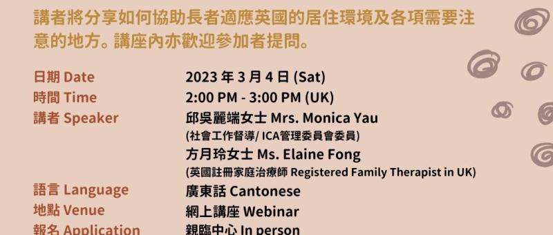 講者將分享如何協助長者適應英國的居住環境及各項需要注意的地方。 講座內亦歡迎參加者提問。