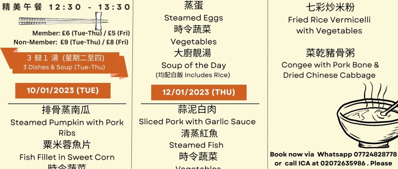 [兔年新春年糕工作坊] 於1月14日 (星期六)早上10:30 - 中午12:30 由資深港人點心師傅霍智輝先生教授,現場示範製作年糕和蘿蔔糕及品賞蘿蔔糕。 會員 £12/ 非會員 £15(包材料費). 名額15人(每名參加者可獲一份年糕製成品),報名:請親臨中心或報名熱缐WhatsApp 07724828778. "Workshop for Lunar New Year Cakes" will be conducted by Senior Dim Sum Master, Mr. FOK Chi Fai on 14th Janurary from 10:30 - 12:30 at ICA Lower Hall. Participants will learn how to make Lunar New Year Cake (or Nian Gao), and…