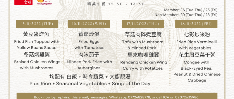 Dear Members: Please see below our lunch menu. Book now by replying this email, messaging Whatsapp 07724828778, or call ICA on 02072635986. Please reserve your place before 11:30am.15/11/2022 (Tue)Fried Fish Topped with Yellow Beans SauceBraised Chicken Wings with MushroomsSeasonal VegetablesChef’s Soup of the Day16/11/2022 (Wed)Fried Eggs with TomatoesMinced Pork Fried with AuberginesSeasonal VegetablesChef’s Soup of the Day17/11/2022…