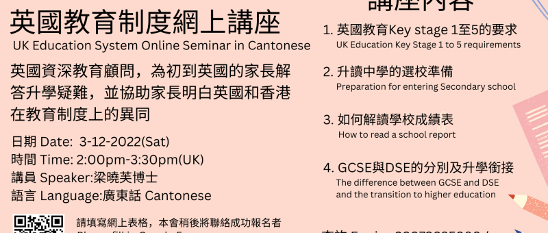 由英國資深教育顧問,為初到英國的家長解答升學疑難,並協助家長明白英國和香港在教育制度上的異同講座內容:1. 英國教育Key stage 1至5的要求2. 升讀中學的選校準備3. 如何解讀學校成績表4. GCSE與DSE的分別及升學銜接日期:2022年12月3日(Sat)時間: 下午2時至3時30分(UK)講員:梁曉芙博士語言:廣東話形式:網上講座名額:50 (先到先得)報名:歡迎有興趣者免費參加,請填寫此表格: https://forms.gle/1A45VmhzV4omNuUa9查詢:02072635986/ info@islingtonchinese.com備註:1. 講座以網上視像形式進行,參加者需準備已連接網絡之手機或電腦2. ICA會電郵聯絡成功報名者,並請勿外傳登入資訊A UK Education System expert will share about the experiences of studying in the UK, and let parents understand the difference between the UK and the Hong Kong education system.Content:1. UK Education Key Stage 1 to 5 requirements2. Preparation for entering Secondary school3.…