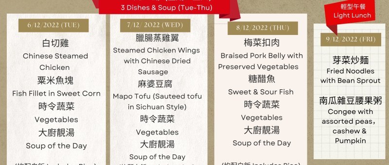 06/12/2022 (Tue) Chinese Steamed Chicken Fish Fillet in Sweet Corn Vegetables Soup of the Day 7/12/2022 (Wed) Steamed Chicken Wings with Chinese Dried Sausage Mapo Tofu (Sauteed tofu in Sichuan Style) Vegetables Soup of the Day 8/12/2022 (Thu) Braised Pork Belly with Preserved VegetablesSweet & Sour Fish Vegetables Soup of the Day 9/12/2022 (Fri) Fried Noodles with Bean…