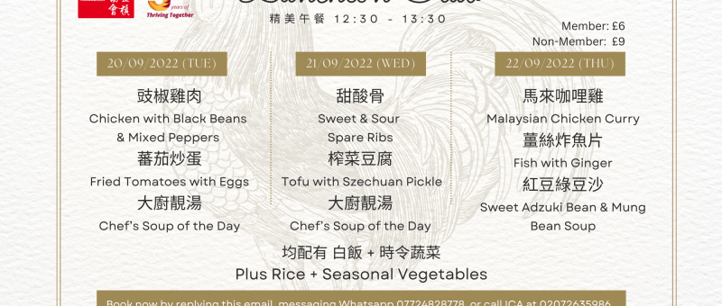 Dear Members: Please see below our lunch menu. Book now by replying to this email, messaging Whatsapp 07724828778, or call ICA at 02072635986. Reservation will be accepted until 11:30am before the lunch. 20/09/2022 (Tue)Chicken with Black Beans & Mixed PeppersFried Tomatoes with EggsSeasonal VegetablesChef’s Soup of the Day 21/09/2022 (Wed)Sweet & Sour Spare RibsTofu with Szechuan PickleSeasonal…
