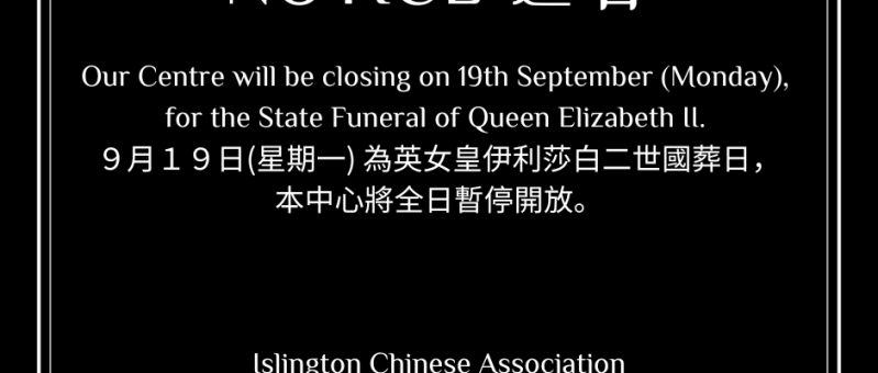 Dear Members,Please note that our Centre will be closing next Monday 19th September for the State Funeral of Queen Elizabeth II. Best regards,Islington Chinese Association 各位會員:下周一9月19日為英女王伊利莎白二世國葬,本中心將暫停開放一天,特此通告。 依士靈頓華人協會 各位会员:下周一9月19日为英女王伊利莎白二世国葬,本中心将暂停开放一天,特此通告。 依士灵顿华人协会
