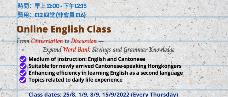 最新ICA網上英語課程:「跟Cathy學英文 – 從日常學好英語」網上英文班 此課程由依士靈頓華人協會 (ICA)主辦,是其「歡迎香港人計劃」之一部分,由住房、社區和地方政府事務部贊助 日期:25/8, 1/9, 8/9, 15/9/2022 (共4堂)逢星期四時間:上午11:00 – 下午12:15名額:12上課語言:英語及廣東話並用上課形式:以網上會議軟件(Zoom)上課,學員需使用電腦、平板電腦或智能電話報名:https://forms.gle/en5PqJbfjR1yK7oo8 或掃描海報上的QR Code費用:四堂共 £12 (非會員£16)繳費方法:成功報名的學員將會收到電話或電郵通知,報名確實後才需要繳費,已繳費用不設退款。 導師簡介:Cathy在香港出生和接受教育,是一位經驗豐富的英語教師,在教成人和兒童英語方面擁有豐富的經驗。她的課程將專注於使用雙語教學,以提高粵語學習者將英語作為第二語言的學習效率。該課程適合剛到英國的香港人。課程的主題將圍繞在英國的實際日常生活體驗。歡迎香港人網頁: https://www.welcomehongkongers.com/ The latest ICA online English class – “ From Conversation to Discussion — Expand Word Bank Savings and Grammar Knowledge”This online English class is organised by Islington Chinese Association as part of its Welcome Hongkongers Programme supported…