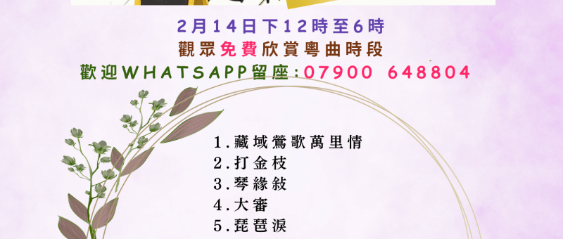 📢 粵曲欣賞免費活動|依士靈頓開心粵曲組 🎭 日期:2026年2月14日(星期六)🕛 時間:中午12:00 至 下午6:00📍 地點:ICA 上層禮堂(Upper Hall) 21 Hatchard Road, London N19 4NG 🎶 現場樂隊伴奏,觀眾免費入場欣賞!依士靈頓開心粵曲組誠邀喜愛粵曲的你前來觀賞! 📲 **留座請 WhatsApp:07900 648804 🪕🪈🎤🎼🎼🎤🪈🪕 🎼 曲目次序如下(如有更改,恕不另行通知): 1 藏域鶯歌萬里情2 打金枝3 琴緣敍4 大審5 琵琶淚6 投宋7 櫻桃落盡春歸去8 三夕恩情廿載仇9 魂回救裴10 梵台續情絲11 魂夢繞山河12 去國題詞 📢 Free Cantonese Opera Appreciation Event|Islington Happy Cantonese Opera Group 🎭 Date: Saturday, 14 February 2026🕛 Time: 12:00…