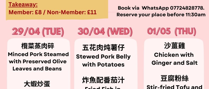 下星期菜單準備好了!當天上午11:30前記得 WhatsApp 07724 828778 留位啦 . The latest Lunch Menu is ready! Remember to WhatsApp 07724 828778 and reserve your seat before 11:30 am on the day. 06/05/2025 (星期二 Tue)釀三寶Stuffed Eggplant and Bell Pepper肉碎炒蛋 Fried Eggs with Minced Pork時令蔬菜 Vegetables大廚靚湯 Soup of the Day 07/05/2025 (星期三 Wed)咖喱雞 Curry Chicken,椒鹽豬扒 Salt & Pepper Pork Chop時令蔬菜 Vegetables大廚靚湯…