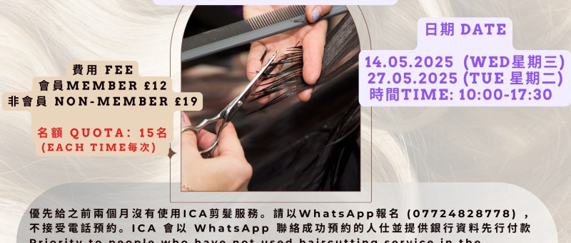 5月剪髮服務在5月14日及5月27日舉行 (六月剪髮服務暫停) , 由Eliz主理,優先給之前兩個月沒有使用ICA剪髮服務的人士。請以WhatsApp報名 (07724828778)。 名額有限,額滿即止. ICA 會以 WhatsApp 跟成功預約的人士進行確認(會員£12,非會員£19). 一經確認及付款, 任何情況均不設退款. 成功報名請準時出席, 如不出席將作棄權 May Haircutting Service is on 14 May & 27 May (No Haircutting service in June). Priority to people who have not used haircutting service in the previous 2 months. Booking must be done by WhatsApp (07724828778) , ICA will notify successful users (£12 for members and…