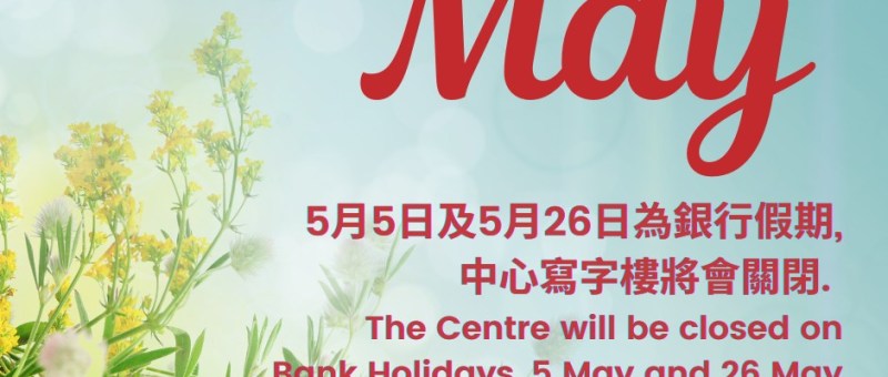 5月5日(星期一) 及5月26日(星期一) 為銀行假期, 中心寫字樓將會關閉. 當日下午1時至6時乒乓球及卡拉OK將會暫停.不便之處, 敬請原諒. The Centre will be closed on Bank Holidays, 5 May (Monday) and 26 May (Monday), table tennis and karaoke will be suspended on these 2 days. We apologise for any inconveniences caused.