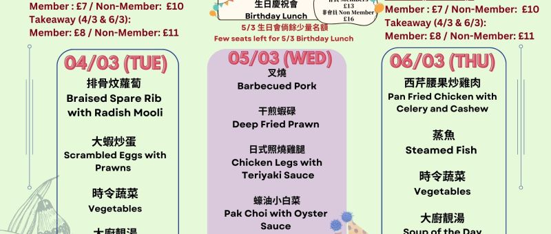 下星期菜單準備好了!當天上午11:30前記得 WhatsApp 07724 828778 留位啦 .The latest Lunch Menu is ready! Remember to WhatsApp 07724 828778 and reserve your seat before 11:30 am on the day 04/03/2025 (星期二 Tue)排骨炆蘿蔔 Braised Spare Rib with Radish Mooli大蝦炒蛋 Scrambled Eggs with Prawns時令蔬菜 Vegetables大廚靚湯 Soup of the Day 05/03/2025 (星期三 Wed) - 生日慶祝會 Birthday Lunch倘餘少量名額, 請於4/3 星期一前訂座 Few seats left,…