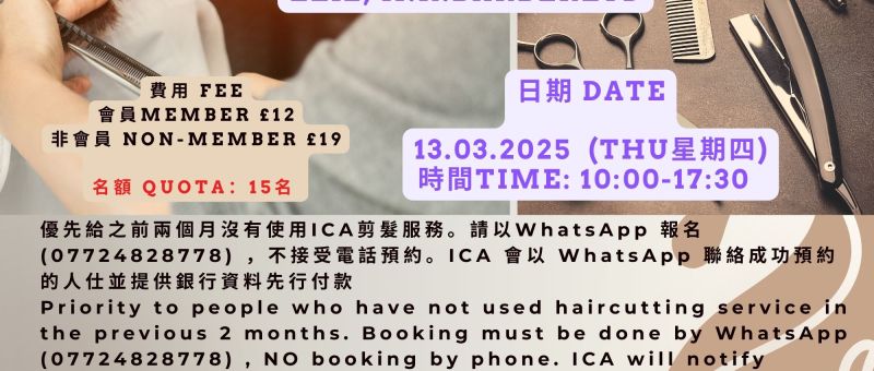 ICA 3月份剪髮服務於3月13日 (星期四) 舉行 , 由Eliz主理。剪髮服務由早上10時至下午5時30分 。如有興趣請以 WhatsApp (07724 828778) 報名, ICA 會以 WhatsApp 跟成功預約的人士進行確認並提供銀行資料先行付款(會員£12,非會員£19)。 ICA will arrange Haircutting service on 13 March (Thu) by Eliz. Haircutting service is from 10:00 to 17:30 . Please book by WhatsApp (07724828778) , ICA will confirm successful users by WhatsApp and provide payment details (£12 for members and…