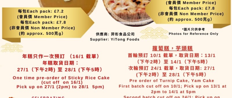 農曆新年將至, 依士靈頓華人協會 (ICA)準備以下食品給 2025 ICA 會員預訂! 請填妥網上表格進行預訂及付款.也歡迎以 WhatsApp 07724828 778 預訂. 可供預訂食品有:年糕只作一次預訂 (16/1 截單)年糕取貨日期: 27/1(下午2時)至 28/1 (下午5時) 蘿蔔糕及芋頭糕 首輪預訂 10/1 截單,取貨日期:13/1 (下午2時)至 14/1(下午5時) 次輪預訂 24/1 截單,取貨日期: 27/1(下午2時)至 28/1(下午5時) 請填寫以下 Google Form https://bit.ly/404PPya 預訂及網上付款, 也歡迎以 WhatsApp 07724828 778 預訂 Lunar New Year is approaching, ICA is now gathering the following items for ICA 2025 members to…