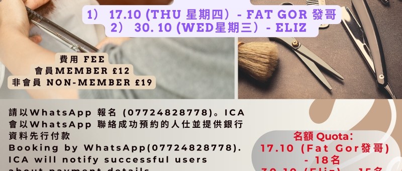 10月份ICA 將會安排兩次剪髮服務。第一次於10月17日 (星期四) 由發哥主理。第二次則於10月30日(星期三)由Eliz主理。剪髮服務由早上10時至下午5時30分 。如有興趣請以 WhatsApp (07724 828778) 報名,報名時請提供選擇剪髮日期及時間, ICA 會以 WhatsApp 跟成功預約的人士進行確認並提供銀行資料先行付款(會員£12,非會員£19)。 ICA will arrange Haircutting service on 2 days in October, 17 Oct (Thu) by Fat Gor and 30 Oct (Wed) by Eliz. Haircutting service is from 10:00 to 17:30 . Please book by WhatsApp (07724828778) by providing Preferred Date and Time. ICA…