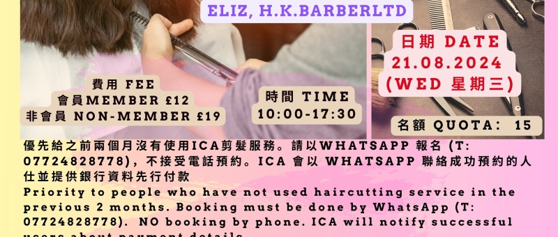 2024年8月第二次剪髮服務 Second Haircutting Service in AugustICA 8月第二次剪髮服務將於8月21日(星期三)由Eliz主理 , 剪髮服務由早上10時至下午5時30(最後預訂時間為下午5時). 我們會優先給之前兩個月沒有使用ICA剪髮服務的朋友。請以WhatsApp 報名 07724828778,不接受電話預約。ICA 會以 WhatsApp 聯絡成功預約的人仕並提供銀行資料先行付款(會員£12,非會員£19).Second haircutting service will be managed by Eliz on 21 August (Wed) from 10:00 to 17:30 (last booking is at 17:00). Priority will be given to people who have not used haircutting service in the previous 2 months. Booking must be…