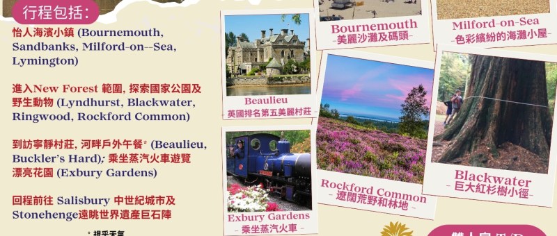 探索英國南部新森林 - 放牧之旅 (5日4夜) 02.09 - 06.09 New Forest 新森林 歐洲最重要的自然和保育地區之一 蘊藏大量稀有植物及野生動物 遊客自由體驗牧養的樂趣 行程包括: 怡人海濱小鎮 (Bournemouth, Sandbanks, Milford-on--Sea, Lymington) 進入New Forest 範圍, 探索國家公園及野生動物 (Lyndhurst, Blackwater, Ringwood, Rockford Common) 到訪寧靜村莊, 河畔戶外午餐* (Beaulieu, Buckler’s Hard); 乘坐蒸汽火車遊覽漂亮花園 (Exbury Gardens) 回程前往 Salisbury 中世紀城市及Stonehenge遠眺世界遺產巨石陣 出發前將以WhatsApp 發送詳細行程及注意事項 * 視乎天氣 行程包括步行國家公園 ,建議自備舒適行山鞋或行山杖 酒店住宿: The Suncliff Hotel Bournemouth, 臨海酒店, 住客免費享用酒店室內暖水泳池,桑拿,健身室等設施. 附有 Spa (另收費)…
