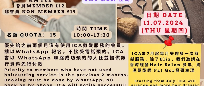 ICA於7月起每月安排兩次剪髮服務,除了Eliz,我們還邀請在香港經營Hair Salon 多年, 資深髮型師 Fat Gor發哥於7月11日(星期四) 到中心負責7月份首輪剪髮服務. 剪髮服務由早上10時至下午5時30(最後預訂時間為下午5時). 我們會優先給之前兩個月沒有使用ICA剪髮服務的朋友。請以WhatsApp 報名,不接受電話預約。ICA 會以 WhatsApp 聯絡成功預約的人仕並提供銀行資料先行付款(會員£12,非會員£19). Starting from July, ICA will arrange one more hairdresser in addition to Eliz to provide haircutting service. We have invited Fat Gor, an experienced hairdresser who has operated a hair salon in Hong Kong for many years to come to arrange…