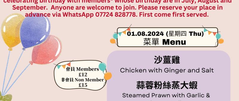 第二季生日慶祝會於8月1日 (星期四) 午餐會進行,為7/8/9月生日的會員共賀生日!當日生日午餐會有特別菜單 (會員 £12/ 非會員 £15), 歡迎任何會員/ 非會員參加,如有興趣請預早 WhatsApp 07724 828778留座,現餘少量名額, 額滿即止。 A special Birthday Celebration Lunch will be held on Thursday 1 August (Members £12, Non Members £15) for celebrating birthday with members whose birthday are in July, August and September. Anyone is welcome to join. Please reserve your place in advance via…