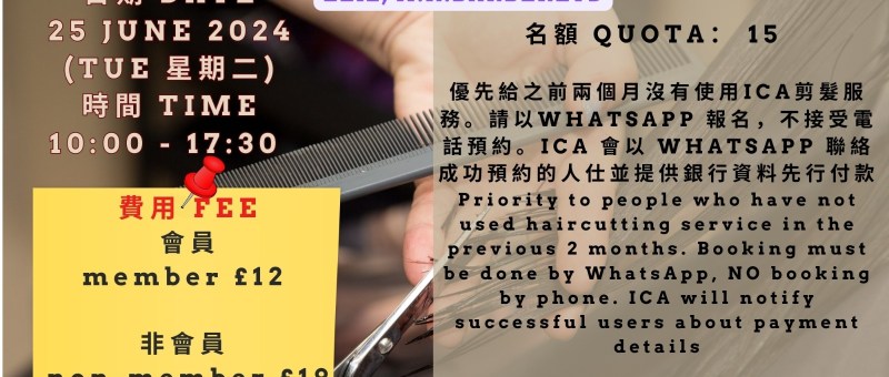 6月份剪髮服務 Haircutting Service in June來自香港的髮型師 Eliz 會於6月25日(星期二) 在中心為會員剪髮. 剪髮服務由早上10時至下午5時30(最後預訂時間為下午5時). 由現在起為讓更多朋友能享用剪髮服務, 我們會優先給之前兩個月沒有使用ICA剪髮服務的朋友。請以WhatsApp 報名,不接受電話預約。ICA 會以 WhatsApp 聯絡成功預約的人仕並提供銀行資料先行付款(會員£12,非會員£19)Haircutting Service is available on 25 June (Tue) from 10:00 to 17:30 (last booking is at 17:00) by the experienced hair stylist, Eliz. Priority will be given to people who have not used haircutting service in the previous 2 months. Booking…