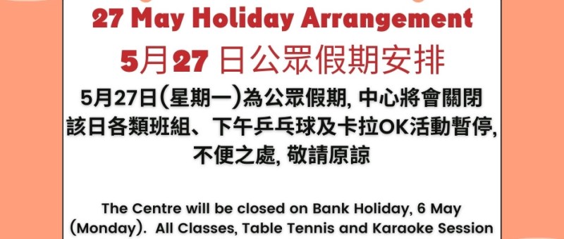 5月27日(星期一)為公眾假期, 中心將會關閉, 該日各類班組、下午乒乓球及卡拉OK活動暫停, 不便之處, 敬請原諒. The Centre will be closed on Bank Holiday, 27 May (Monday). All Classes, Table Tennis and Karaoke Session will be suspended on that day. We apologise for any inconveniences caused.