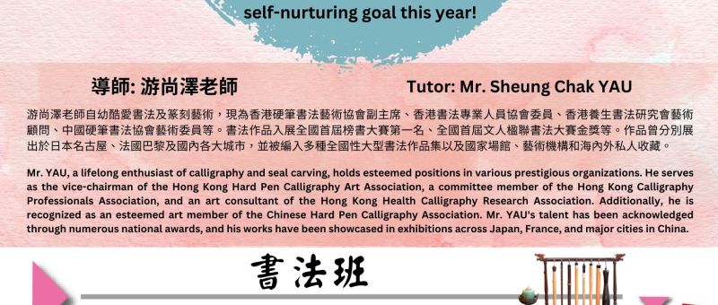 寫書法也能養生!? 沒錯,寫書法好處多多,除了摒除雜念、平穩情緒之外,更是可以訓練全身穩定跟協調性的緩和運動、適合所有年齡的全方位保健方式。今年的自我養生目標,就從寫毛筆字開始吧! Discover the health benefits of calligraphy! It calms emotions, improves coordination, and is suitable for all ages. Make calligraphy your self-nurturing goal this year! 日期 Date: 3/6, 10/6, 17/6, 24/6; 1/7, 8/7, 15/7, 22/7, 29/7 (星期一 Monday) 時間 Time: 11:30am - 1:00pm (1.5 小時 / hours) [學員可早半小時到達自行練習 Students are welcome to come 30…