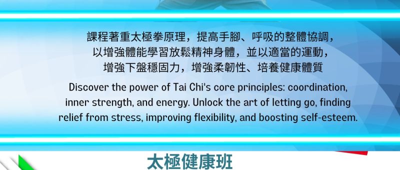 課程著重太極拳原理,提高手腳、呼吸的整體協調,以增強體能學習放鬆精神身體,並以適當的運動,增強下盤穩固力,增強柔韌性、培養健康體質。 Discover the power of Tai Chi's core principles: coordination, inner strength, and energy. Unlock the art of letting go, finding relief from stress, improving flexibility, and boosting self-esteem. 日期 Date: 4/6, 11/6, 18/6, 25/6; 2/7, 9/7, 16/7, 23/7, 30/7 (星期二 Tue) 時間 Time: 11:15am - 12:15pm 費用 Fee: 6月份 Jun: 4堂 (4 sessions) -…