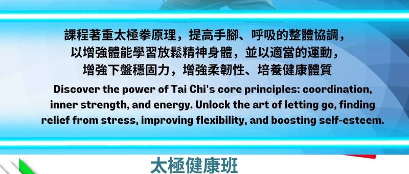 課程著重太極拳原理,提高手腳、呼吸的整體協調,以增強體能學習放鬆精神身體,並以適當的運動,增強下盤穩固力,增強柔韌性、培養健康體質。 Discover the power of Tai Chi's core principles: coordination, inner strength, and energy. Unlock the art of letting go, finding relief from stress, improving flexibility, and boosting self-esteem. 日期 Date: 7/5, 14/5, 21/5, 28/5 (星期二 Tue) 時間 Time: 11:15am - 12:15pm 費用 Fee: 5月份 May: 4堂 (4 sessions) - 會員 Members £12, 非會員 Non-members…