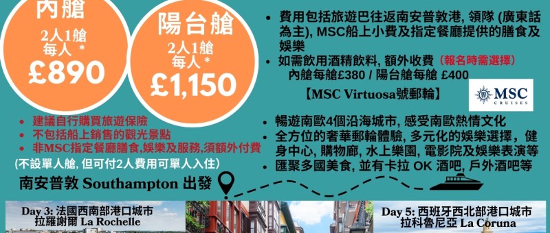 2024郵輪之旅- 法國、西班牙8日7夜 (22-29/6/2024) 內艙2人1艙,每人£890陽台艙2人1艙每人£1,150(不設單人艙, 但可付2人費用可單人入住) 只限ICA會員• 乘坐【MSC Virtuosa號郵輪】由南安普敦 Southampton 出發, 暢遊南歐4個沿海城市 (法國西南部港口城市拉羅謝爾 La Rochelle , 西班牙北部沿海城市畢爾包Bilbao, 西班牙西北部港口城市拉科魯尼亞 La Coruna及法國西北部軍港瑟堡 Cherbourg), 感受南歐熱情文化• 全方位的奢華郵輪體驗, 多元化的娛樂選擇,健身中心, 購物廊, 水上樂園, 電影院及娛樂表演等• 匯聚多國美食, 並有卡拉 OK 酒吧, 戶外酒吧等 團費包括:• 費用包括旅遊巴往返南安普敦港, 領隊 (廣東話為主), MSC船上小費及指定餐廳提供的膳食及娛樂• 如需飲用酒精飲料, 額外收費,報名時需選擇 (內艙每艙£380 / 陽台艙每艙 £400)團費不包括:• 船上銷售的觀光景點• 非MSC指定餐廳膳食,娛樂及服務,須額外付費• 建議自行購買旅遊保險 報名時間:4月17日(星期三) 下午2:00起接受報名名額有限,建議報名時繳付全費以儘快確認位置 ,額滿即止, 上限報四位報名方法:1) 親臨本會;或2) WhatsApp 07436 854117 報名 (成功與否,將以WhatsApp回覆作實請在報名時提供1)…