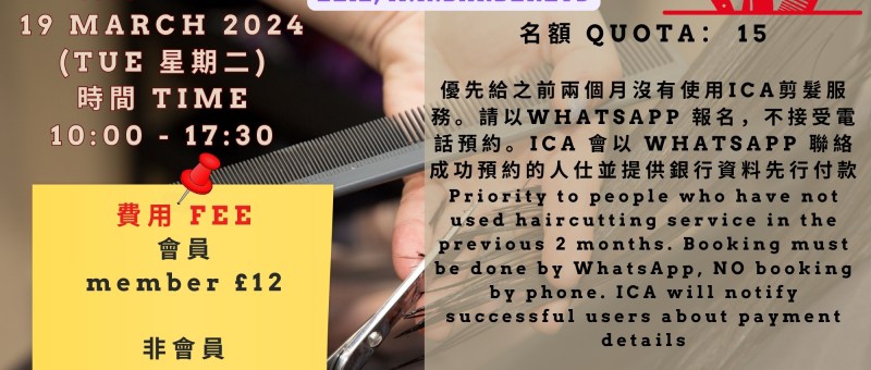 來自香港的髮型師 Eliz 會於3月19日(星期二) 在中心為會員剪髮. 剪髮服務由早上10時至下午5時30(最後預訂時間為下午5時). 由現在起為讓更多朋友能享用剪髮服務, 我們會優先給之前兩個月沒有使用ICA剪髮服務的朋友。請以WhatsApp 報名,不接受電話預約。ICA 會以 WhatsApp 聯絡成功預約的人仕並提供銀行資料先行付款(會員£12,非會員£19)Haircutting Service is available on 19 March (Tue) from 10:00 to 17:30 (last booking is at 17:00) by the experienced hair stylist, Eliz. Priority will be given to people who have not used haircutting service in the previous 2 months. Booking must be done by…