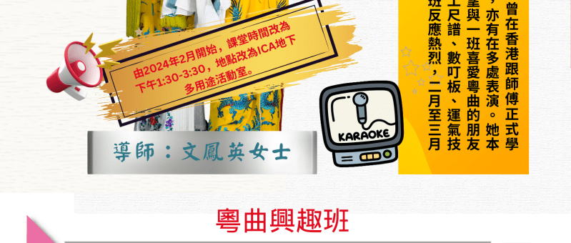粵曲興趣班內容包括練聲、工尺譜、數叮板、運氣技巧,歡迎初學者參加。