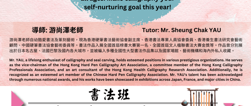 寫書法也能養生!? 沒錯,寫書法好處多多,除了摒除雜念、平穩情緒之外,更是可以訓練全身穩定跟協調性的緩和運動、適合所有年齡的全方位保健方式。今年的自我養生目標,就從寫毛筆字開始吧! Discover the health benefits of calligraphy! It calms emotions, improves coordination, and is suitable for all ages. Make calligraphy your self-nurturing goal this year! 日期 Date: 4/3, 11/3, 18/3, 25/3 (星期一 Mon) 時間 Time: 11:30am - 1:00pm (1.5 小時 / hours) [學員可早半小時 (11:00am) 到達自行練習 Students are welcome to come 30 minutes earlier for…