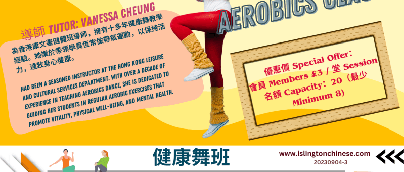 跳健康舞好處多多,不但可強身健體,擴展社交網絡,且對精神健康甚有裨益 - 增強記憶力、改善抑鬱、延緩腦退化。寒冬即將過去,快來鍛鍊健康身心,迎接和暖陽光! Aerobics dance is great for your health in many ways! Not only does it make your body stronger and help you make new friends, but it is also really good for your mind. 日期 Date: 6/3, 13/3, 20/3, 27/3 (星期三 Wed) 時間 Time: 11:15am - 12:30pm 費用 Fee: 4堂/classes-會員 Members £12; Non-members…