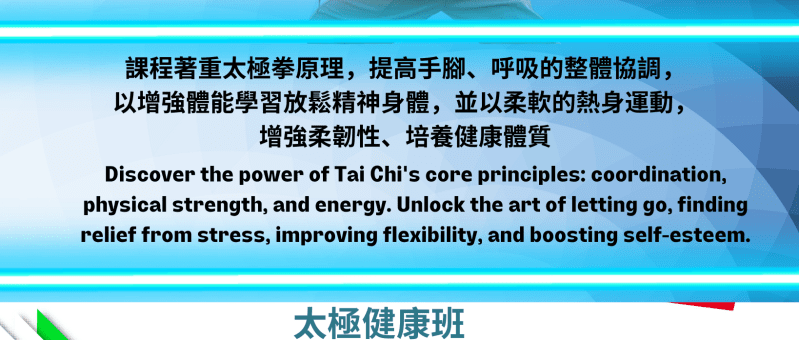 課程著重太極拳原理,提高手腳、呼吸的整體協調,以增強體能學習放鬆精神身體,並以柔軟的熱身運動,增強柔韌性、培養健康體質 Discover the power of Tai Chi's core principles: coordination, physical strength, and energy. Unlock the art of letting go, finding relief from stress, improving flexibility, and boosting self-esteem. 日期 Date: 5/3, 12/3, 19/3, 26/3 (星期二 Tue) 時間 Time: 11:15am - 12:15pm 費用 Fee: : 4堂 (4 sessions) - 會員 Members £12, 非會員 Non-members £20…