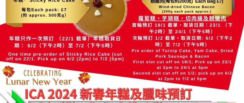 農曆新年將至, 依士靈頓華人協會 (ICA)準備以下食品給會員預訂, 送禮自用兩相宜! 請填妥網上表格進行預訂及付款. 可供預訂食品有: 年糕只作一次預訂 (22/1 截單)年糕取貨日期: 6/2(下午2時)至 7/2(下午5時) 蘿蔔糕,芋頭糕,切肉腸及靚臘肉 首輪預訂 18/1 截單,取貨日期:23/1 (下午2時)至 24/1(下午5時) 次輪預訂 1/2 截單,取貨日期: 6/2(下午2時)至 7/2(下午5時) 請填寫以下 Google Form bit.ly/48I6lXH 預訂及網上付款, 也歡迎以 WhatsApp 07724828 778 預訂 Lunar New Year is approaching, ICA is now gathering the following items for members to pre-order as gifts or your own use! Fill…