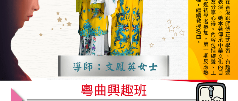粵曲興趣班內容包括練聲、工尺譜、數叮板、運氣技巧,歡迎初學者參加。