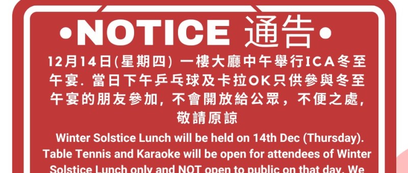 12月14日(星期四) 一樓大廳中午舉行ICA冬至午宴. 當日下午乒乓球及卡拉OK只供參與冬至午宴的朋友參加, 不會開放給公眾,不便之處, 敬請原諒. Winter Solstice Lunch will be held on 14th Dec (Thursday). Table Tennis and Karaoke will be open for attendees of Winter Solstice Lunch only and NOT open to public on that day. We apologise for any inconveniences caused.