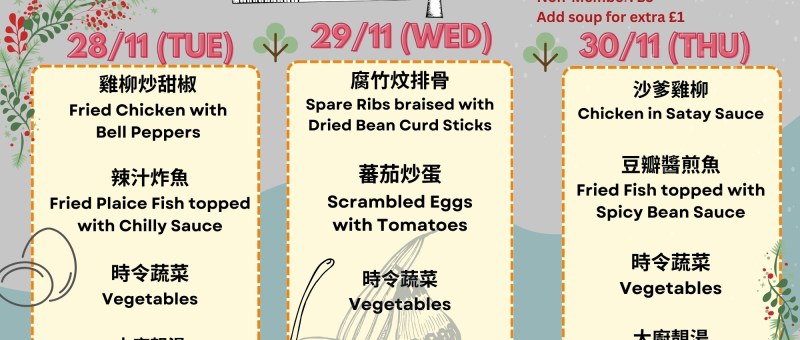 下星期菜單準備好了!當天上午11:30前記得 WhatsApp 07724 828778 留位啦! The latest Lunch Menu is ready! Remember to WhatsApp 07724 828778 and reserve your seat before 11:30 am on the day. 28/11/2023 (星期二 Tue)雞柳炒甜椒 Fried Chicken with Bell Peppers辣汁炸魚Fried Plaice Fish topped with Chilly Sauce時令蔬菜 Vegetables大廚靚湯 Soup of the Da 29/11/2023 (星期三 Wed)腐竹炆排骨 Spare Ribs braised with Dried Bean Curd…