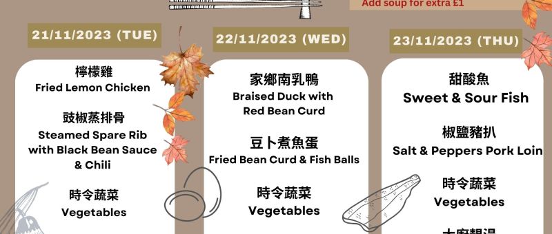 下星期菜單準備好了!當天上午11:30前記得 WhatsApp 07724 828778 留位啦! The latest Lunch Menu is ready! Remember to WhatsApp 07724 828778 and reserve your seat before 11:30 am on the day. 21/11/2023 (星期二 Tue)檸檬雞 Fried Lemon Chicken豉椒蒸排骨 Steamed Spare Rib with Black Bean Sauce & Chili時令蔬菜 Vegetables大廚靚湯 Soup of the Da 22/11/2023 (星期三 Wed)家鄉南乳鴨 Braised Duck with Red Bean Curd豆卜煮魚蛋…