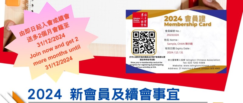 依士靈頓華人協會2024年度會籍現正式接受申請及續會! 歡迎親臨本會或填寫此Google Form https://bit.ly/3s8j3iX 進行續會或新會員手續及付款. 完成後本會於五個工作天將透過電郵或Whatsapp 發送電子會員證。 Islington Chinese Association 2024 Membership is now officially ready for New Applications and Renewals at the Centre or fill out this Google Form https://bit.ly/3s8j3iX and make payment online. ICA will send the electronic membership card by email or WhatsApp within 5 working days after completing the form and…
