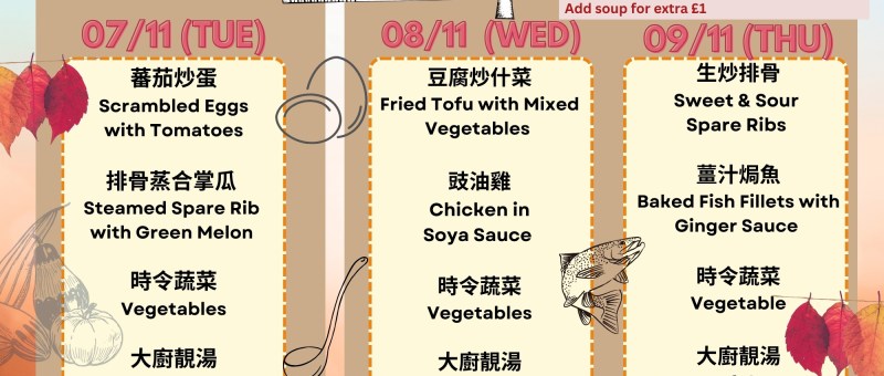 下星期菜單準備好了!當天上午11:30前記得 WhatsApp 07724 828778 留位啦! The latest Lunch Menu is ready! Remember to WhatsApp 07724 828778 and reserve your seat before 11:30 am on the day. 07/11/2023 (星期二 Tue)蕃茄炒蛋 Scrambled Eggs with Tomatoes排骨蒸合掌瓜 Steamed Spare Rib with Green Melon時令蔬菜 Vegetables大廚靚湯 Soup of the Da 08/11/2023 (星期三 Wed)豆腐炒什菜 Fried Tofu with Mixed Vegetables豉油雞 Chicken in Soya…