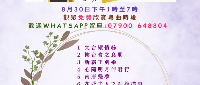 📢 粵曲欣賞免費活動|依士靈頓開心粵曲組 🎭 日期:2025年8月30日(星期六)🕐 時間:下午1:00 至 7:00📍 地點:21 Hatchard Road, London N19 4NG🎶 現場樂隊伴奏,觀眾免費入場欣賞!依士靈頓開心粵曲組誠邀喜愛粵曲的你前來觀賞! 📲 留座請 WhatsApp:07900 648804 🪕🪈🎤🎼🎼🎤🪈🪕 🎼 曲目次序如下(如有更改,恕不另行通知): 1 梵台續情絲2 樓台會之良朋3 新霸王別姬4 心隨明月伴君行5 南唐殘夢6 花蕊夫人之劫後描容7 殺忠妻8 幾度悔情慳9 艷曲醉周郎10 高山流水會知音11 李後主之歸天12 玉簪記之琴挑 📢 Free Cantonese Opera Appreciation Event|Islington Happy Cantonese Opera Group 🎭 Date: Saturday, 30 August 2025🕐 Time: 1:00 pm – 7:00…