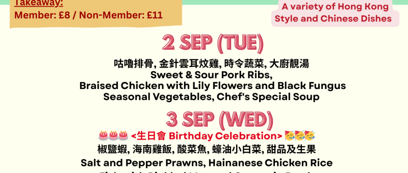 📅 下週午餐菜單 Lunch Menu記得於 當天上午11:30前 WhatsApp 07724 828778 預留位置 😋😋😋Please WhatsApp 07724 828778 before 11:30 am on the day to reserve your seat 😋😋😋 📌 2/9(星期二)咕嚕排骨金針雲耳炆雞時令蔬菜大廚靚湯 Sweet & Sour Pork RibsBraised Chicken with Lily Flowers and Black FungusSeasonal VegetablesChef's Special Soup 📌 3/9(星期三) <生日會 Birthday Celebration>椒鹽蝦海南雞飯酸菜魚蠔油小白菜 Salt and Pepper PrawnsHainanese Chicken RiceFish with Pickled Mustard…