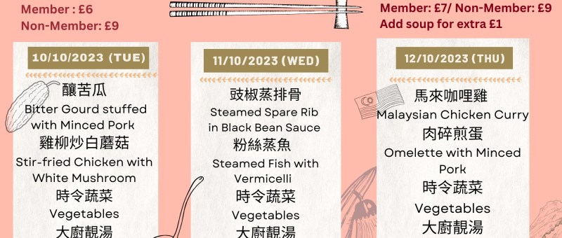 下星期菜單準備好了!當天上午11:30前記得 WhatsApp 07724 828778 留位啦! The latest Lunch Menu is ready! Remember to WhatsApp 07724 828778 and reserve your seat before 11:30 am on the day. 10/10/2023 (星期二Tue) 釀苦瓜 Bitter Gourd stuffed with Minced Pork 雞柳炒白蘑菇 Stir-fried Chicken with White Mushroom 時令蔬菜 Vegetables 大廚靚湯 Soup of the Day 11/10/2023 (星期三Wed) 豉椒蒸排骨 Steamed Spare Rib in Black…