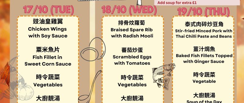 下星期菜單準備好了!當天上午11:30前記得 WhatsApp 07724 828778 留位啦! The latest Lunch Menu is ready! Remember to WhatsApp 07724 828778 and reserve your seat before 11:30 am on the day. 17/10/2023 (星期二Tue) 豉油皇雞翼 Chicken Wings with Soy Sauce 粟米魚片 Fish Fillet in Sweet Corn Sauce 時令蔬菜 Vegetables 大廚靚湯 Soup of the Day 18/10/2023 (星期三Wed) 排骨炆蘿蔔 Braised Spare Rib with…