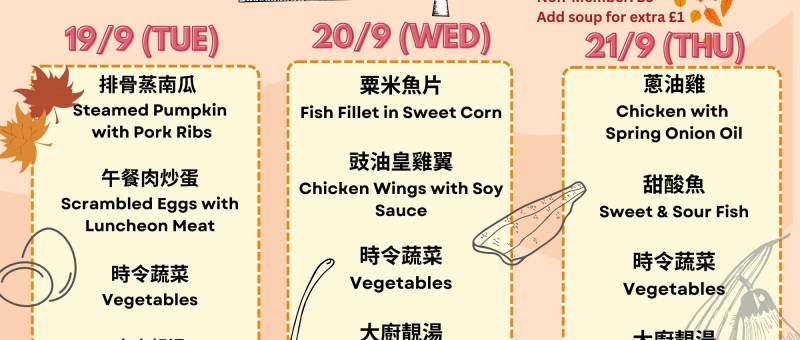 下星期菜單準備好了!當天上午11:30前記得 WhatsApp 07724 828778 留位啦! The latest Lunch Menu is ready! Remember to WhatsApp 07724 828778 and reserve your seat before 11:30 am on the day. 19/09/2023 (星期二Tue) 排骨蒸南瓜 Steamed Pumpkin with Pork Ribs 午餐肉炒蛋 Scrambled Eggs with Luncheon Meat 時令蔬菜 Vegetables 大廚靚湯 Soup of the Day 20/09/2023 (星期三Wed) 粟米魚片 Fish Fillet in Sweet Corn…