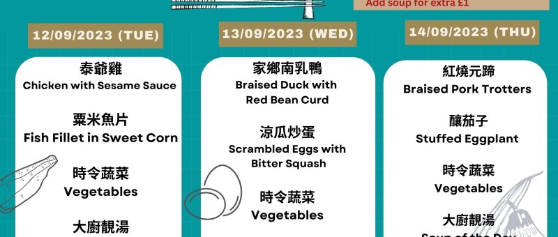 下星期菜單準備好了!當天上午11:30前記得 WhatsApp 07724 828778 留位啦! The latest Lunch Menu is ready! Remember to WhatsApp 07724 828778 and reserve your seat before 11:30 am on the day. 12/09/2023 (星期二Tue) 泰爺雞 Chicken with Sesame Sauce 粟米魚片 Fish Fillet in Sweet Corn 時令蔬菜 Vegetables 大廚靚湯 Soup of the Day 13/09/2023 (星期三Wed) 家鄉南乳鴨 Braised Duck with Red Bean Curd…