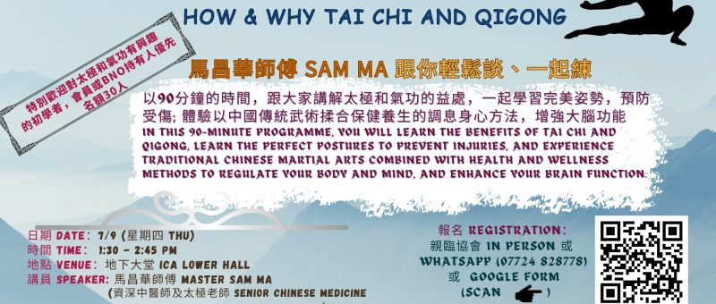 以90分鐘的時間,跟大家講解太極和氣功的益處,一起學習完美姿勢,預防受傷; 體驗以中國傳統武術揉合保健養生的調息身心方法,增強大腦功能 In this 90-minute programme, you will learn the benefits of Tai Chi and Qigong, learn the perfect postures to prevent injuries, and experience traditional Chinese martial arts combined with health and wellness methods to regulate your body and mind, and enhance your brain function 日期 Date: 7/9/2023 (星期四) (Thu)時間 Time: 1:30 - 2:45 PM地點 Venue: ICA…