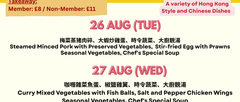 📅 下週午餐菜單 Lunch Menu記得於 當天上午11:30前 WhatsApp 07724 828778 預留位置 😋😋😋Please WhatsApp 07724 828778 before 11:30 am on the day to reserve your seat 😋😋😋 📌 26/08(星期二)梅菜蒸豬肉碎大蝦炒雞蛋時令蔬菜大廚靚湯Steamed Minced Pork with Preserved VegetablesStir-fried Egg with PrawnsSeasonal VegetablesChef’s Special Soup 📌 27/08(星期三)咖喱雜菜魚蛋椒鹽雞翼時令蔬菜大廚靚湯Curry Mixed Vegetables with Fish BallsSalt and Pepper Chicken WingsSeasonal VegetablesChef’s Special Soup 📌 28/08(星期四)豉汁蒸三文魚頭薯仔排骨時令蔬菜大廚靚湯Steamed Salmon Head…