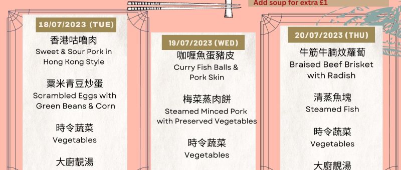 下星期菜單準備好了!當天上午11:30前記得 WhatsApp 07724 828778 留位啦! The latest Lunch Menu is ready! Remember to WhatsApp 07724 828778 and reserve your seat before 11:30 am on the day. 18/07/2023 (星期二Tue) 香港咕嚕肉 Sweet & Sour Pork in Hong Kong Style 粟米青豆炒蛋 Scrambled Eggs with Green Beans & Corn 時令蔬菜 Vegetables 大廚靚湯 Soup of the Day 19/07/2023 (星期三Wed) 咖喱魚蛋豬皮…
